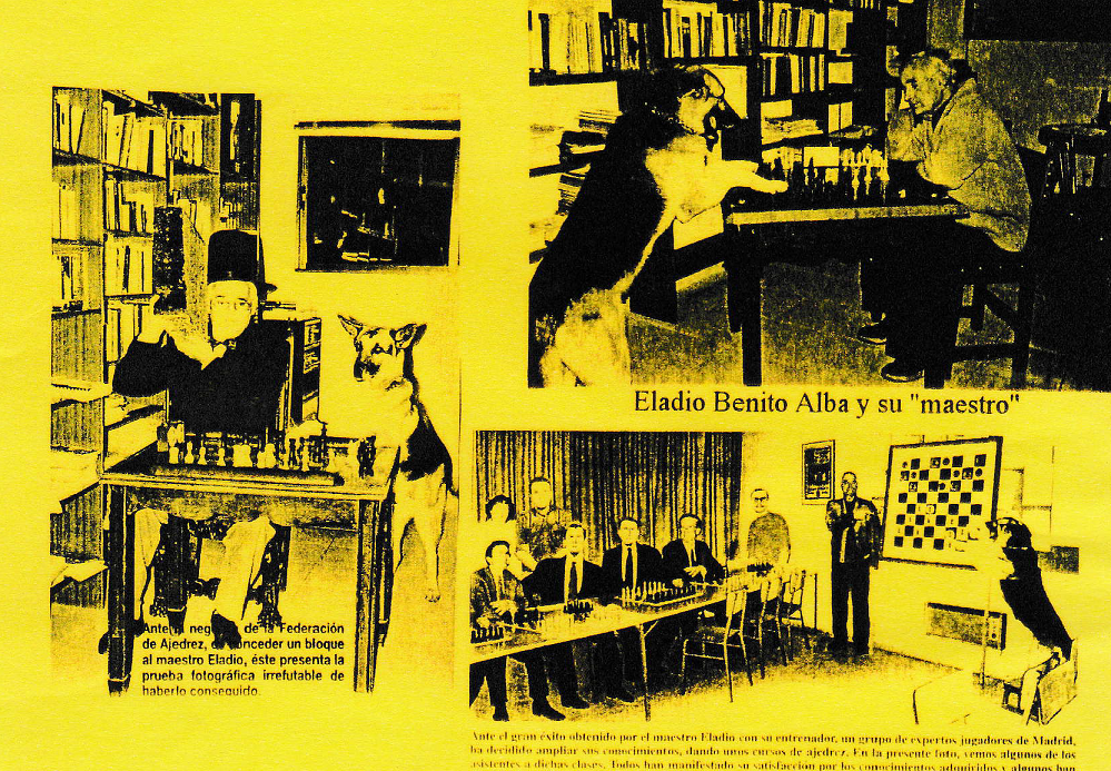 Queridos amigos capeistas: Tal como ya sabeís nuestro inolvidable amigo, Eladio Benito Alba, ha fallecido. Todos lo recordaremos como una persona de gran humor. por Navidades solia enviarnos una tarjeta humorística y un año me dijo que no sabía que escribir y que con mi permiso copiaba mi tarjeta-de visita de los Presidentes y papa y se disculpaba. Le dje que fué correcto al informarme y que llevase adelante su idea de enviarnos esa tarjeta. Siempre estaba rodeado de amigos y le gustaba mucho tener la palabra explicando anécdotas. Lo conocí personalmente en Plaza Mayor, en el Club de Ajedrez de nuestro buen amigo, Ricardo Lamarca Barrios, y nos vimos en los Torneos Internacionales de Benidorm, en La Pobla de Lillet y en Benasque. allí era donde él más disfrutaba. Ese Torneo tenía cada año una gran participación de madrileños y yo también estaba a menudo con ellos, tanto en las excursiones que solía organizar por las mañanas arriba en la montaña y reuniones por las noches. Por las tardes todo era ajedrez. Le gustaba mucho tener sus " duelos" con el amigo, René Mayer. Durante años difrutó mucho con su perro-lobo, al cual lo tenía muy bien amaestrado, tal como podeis ver en una de las fotos en que está dando clases de ajedrez en tablero mural. Existe otra foto que no he podido encontrar, en donde está dando una sesión de simultáneas a 8 -10 tableros ! ![]() Adios amigo Eladio, los capeistas nunca te olvidaremos. " |